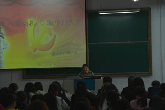 开班仪式结束后,党总支书记杨丽波为本次培训班作题为《端正入党动机,争取早日入党》的开班讲座。杨书记用朴实语言,从大家的基本情况分析,阐明只有坚持为人民服务的信念,才是最纯粹,端正、正确的入党动机。之后又向在座的积极分子提出要求:要不断学习,端正动机;加强世界观的改造,树立正确的人生观价值观;从小事做起,从身边做起,遵守校规校纪;在学习生活中起到模范带头作用,不断完善自我。只有这样才能做到早日入党。最后杨书记引用伟人毛泽东同志的话——希望大家都做到“先思想上入党,再组织上入党”为此次讲座划上句号。