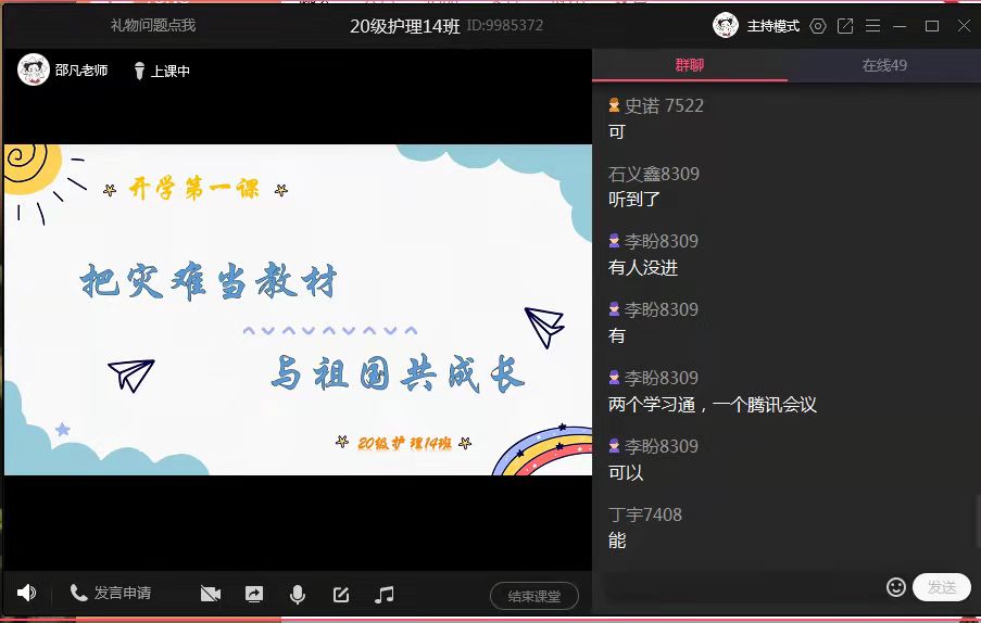 辅导员们带领同学们学习了习近平总书记“7.1”讲话和郑邦山厅长的讲话精神,重申了新学期的纪律规矩和疫情防控要求,使同学们在接受思想洗礼的同时,提高纪律和规矩意识。此外,通过讲道理和讲故事相结合的方式,把救灾抗疫中涌现出的先进人物、典型事例及时推进线上课堂,持续引导同学们在灾难中学会责任担当,在感动中感悟、在感悟中成长,将这场突发灾难转化为民族振兴的宝贵精神资源,从逆行英雄先进事迹中汲取力量、茁壮成长!