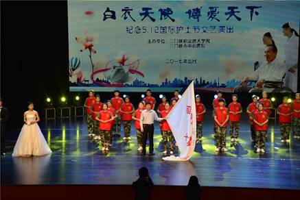 演出中,校领导马旭东为yl6809永利新成立的“天使之翼红十字志愿服务队”授旗,yl6809永利和市中心医院的领导还为获得护理技能竞赛优秀辅导老师代表、优秀护士长、优秀男护、优秀护士、培训教师进行了表彰颁奖。