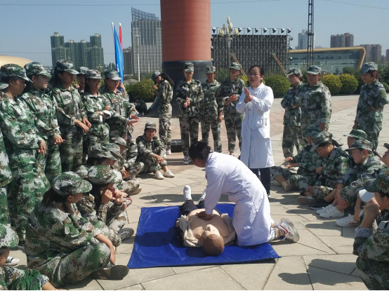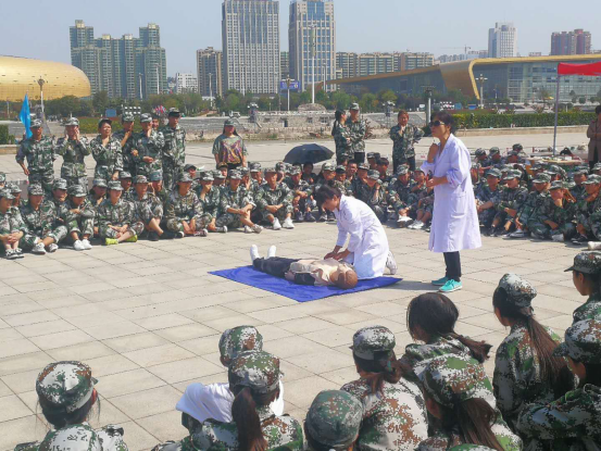 在军训过程中,为普及救护知识和技能,提高新生的自救互救意识,校医院组织医生给新生们做户外心肺复苏术的演练培训,受到了同学们的热烈欢迎。