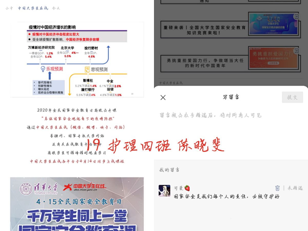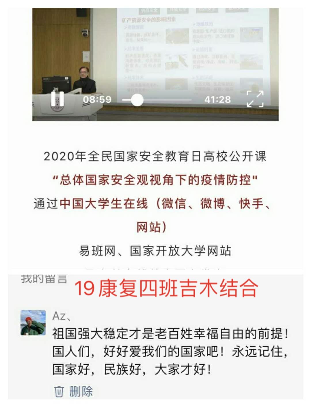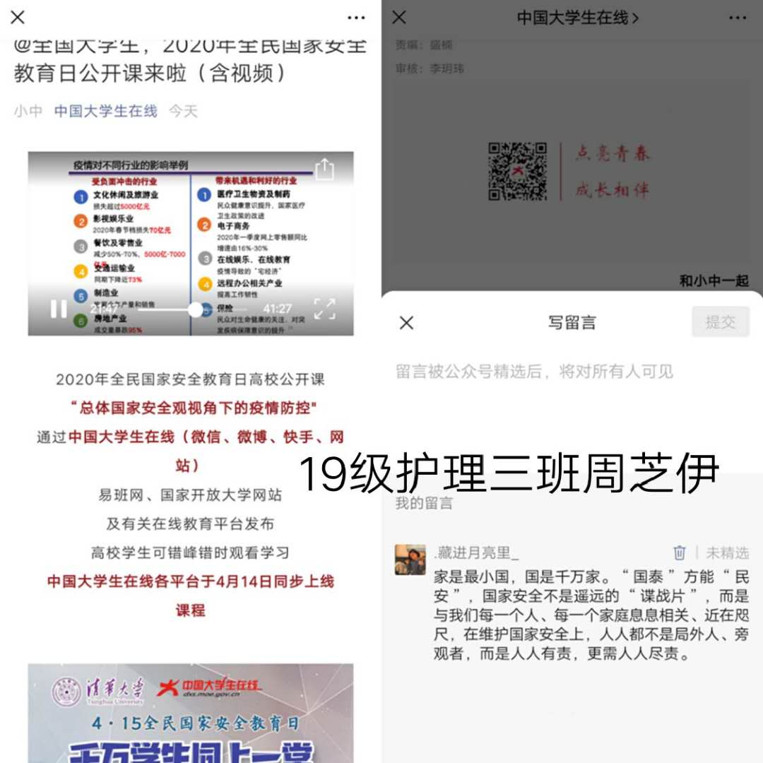 公司还紧密结合当前新冠肺炎疫情防控突出形势任务,为提高广老员工的国家安全防范意识和能力, 树立“国家安全、人人有责”的观念,4月13--15日之间组织各班以“深入认识国家安全,巩固新冠肺炎疫情防控成果”线上主题班会。同时利用院部网站、筑梦医护微信平台、班级QQ群等媒介推送了一批应知应会的国家安全常识、相关法律内容以及宣传公共卫生安全、生物安全等非传统安全内容。