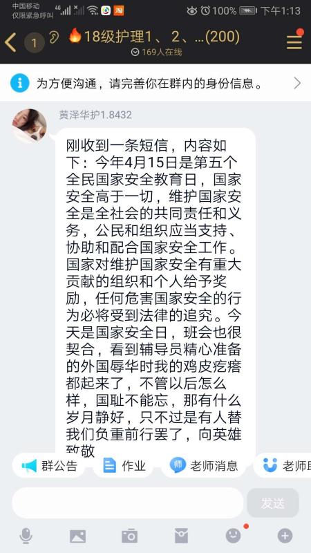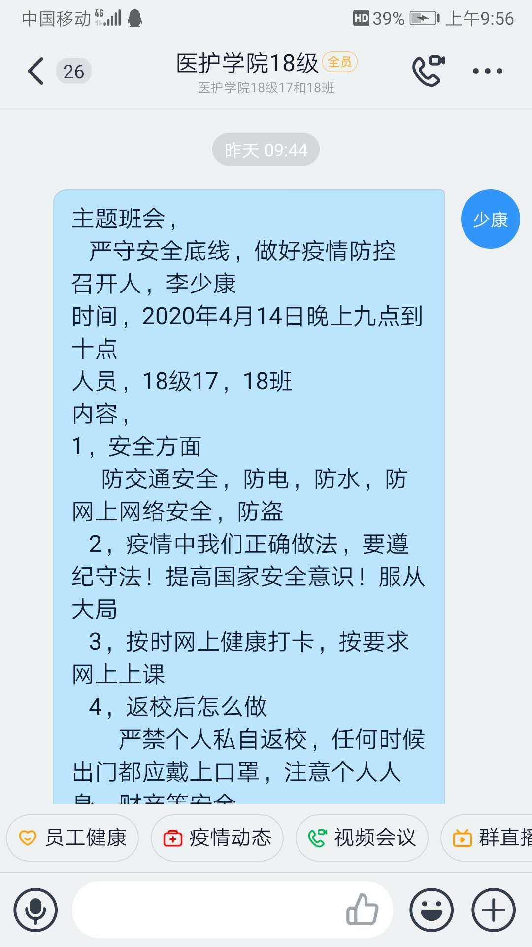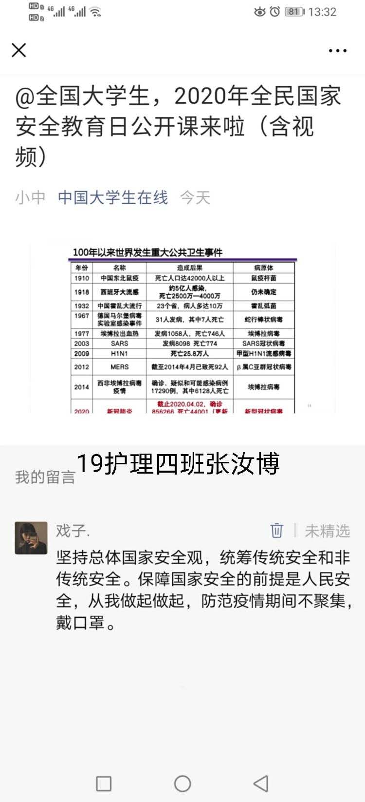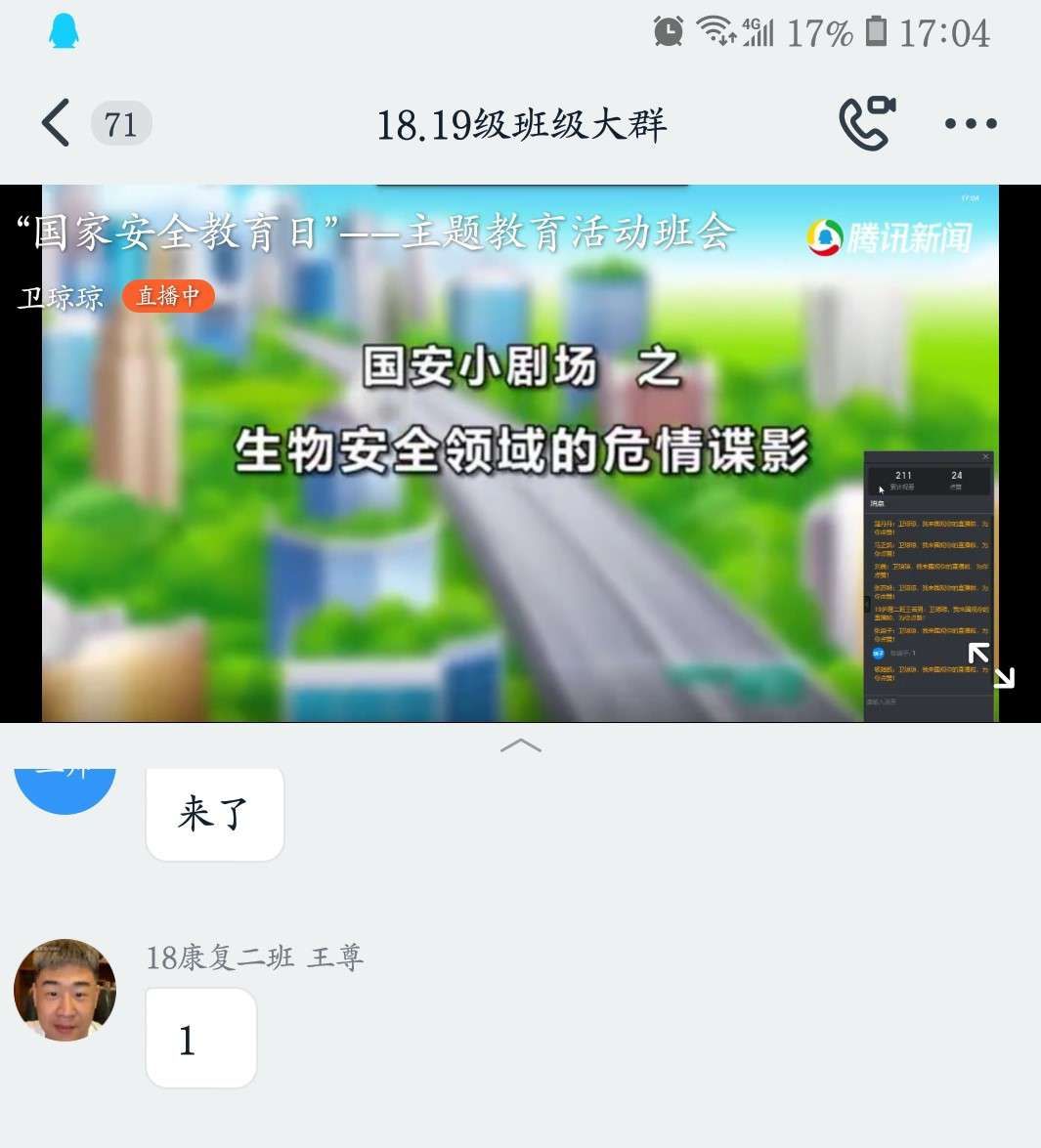 公司还紧密结合当前新冠肺炎疫情防控突出形势任务,为提高广老员工的国家安全防范意识和能力, 树立“国家安全、人人有责”的观念,4月13--15日之间组织各班以“深入认识国家安全,巩固新冠肺炎疫情防控成果”线上主题班会。同时利用院部网站、筑梦医护微信平台、班级QQ群等媒介推送了一批应知应会的国家安全常识、相关法律内容以及宣传公共卫生安全、生物安全等非传统安全内容。