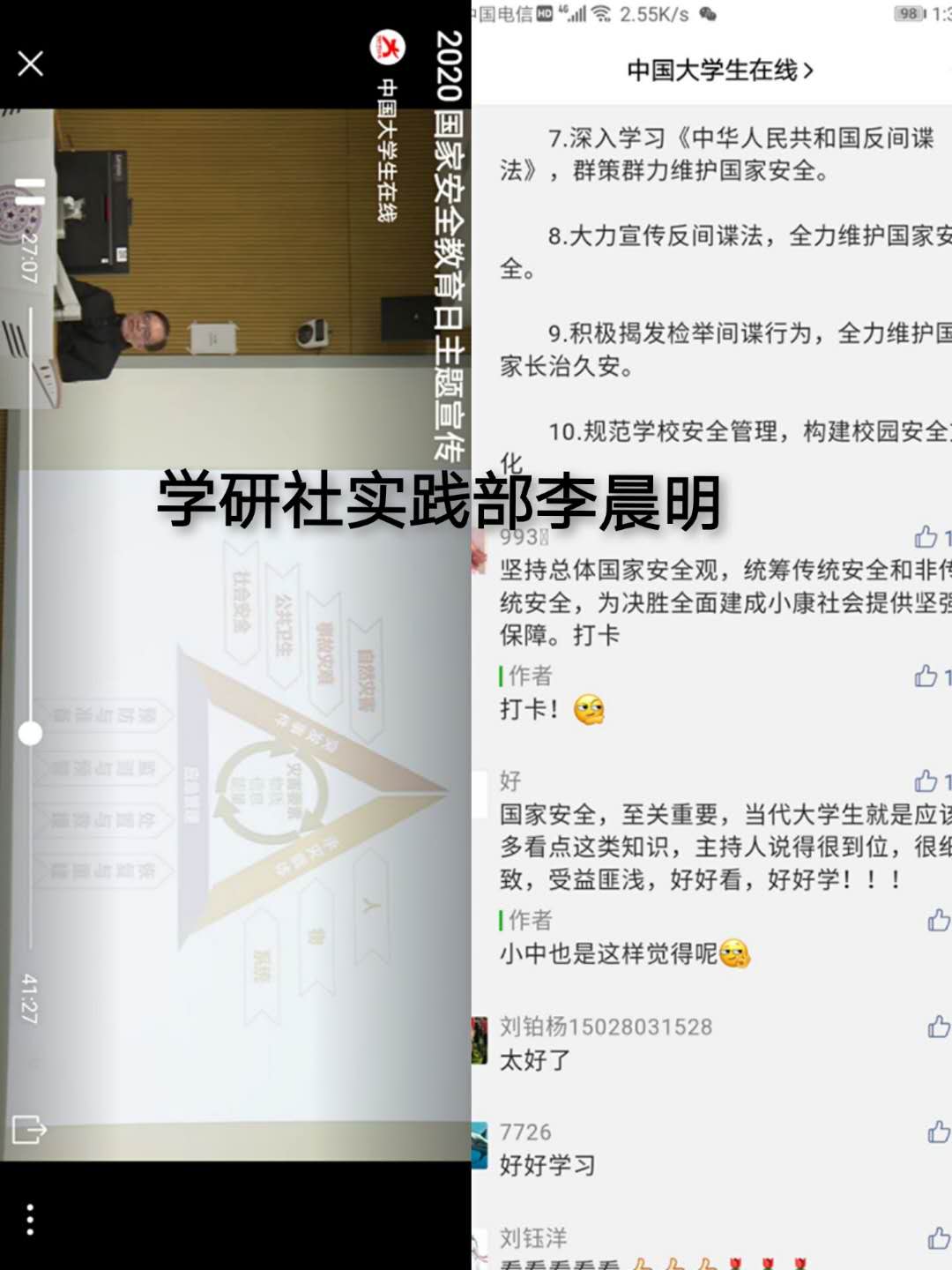 如:《国家安全法》、《反间谍法》、《反恐怖主义法》《网络安全法》《 公共卫生安全知识》以及《生物安全》网络微课堂等,通过多种形式的宣传教育,让同学们形成维护国家安全的强大共识,增强维护国家安全的责任感和使命感。