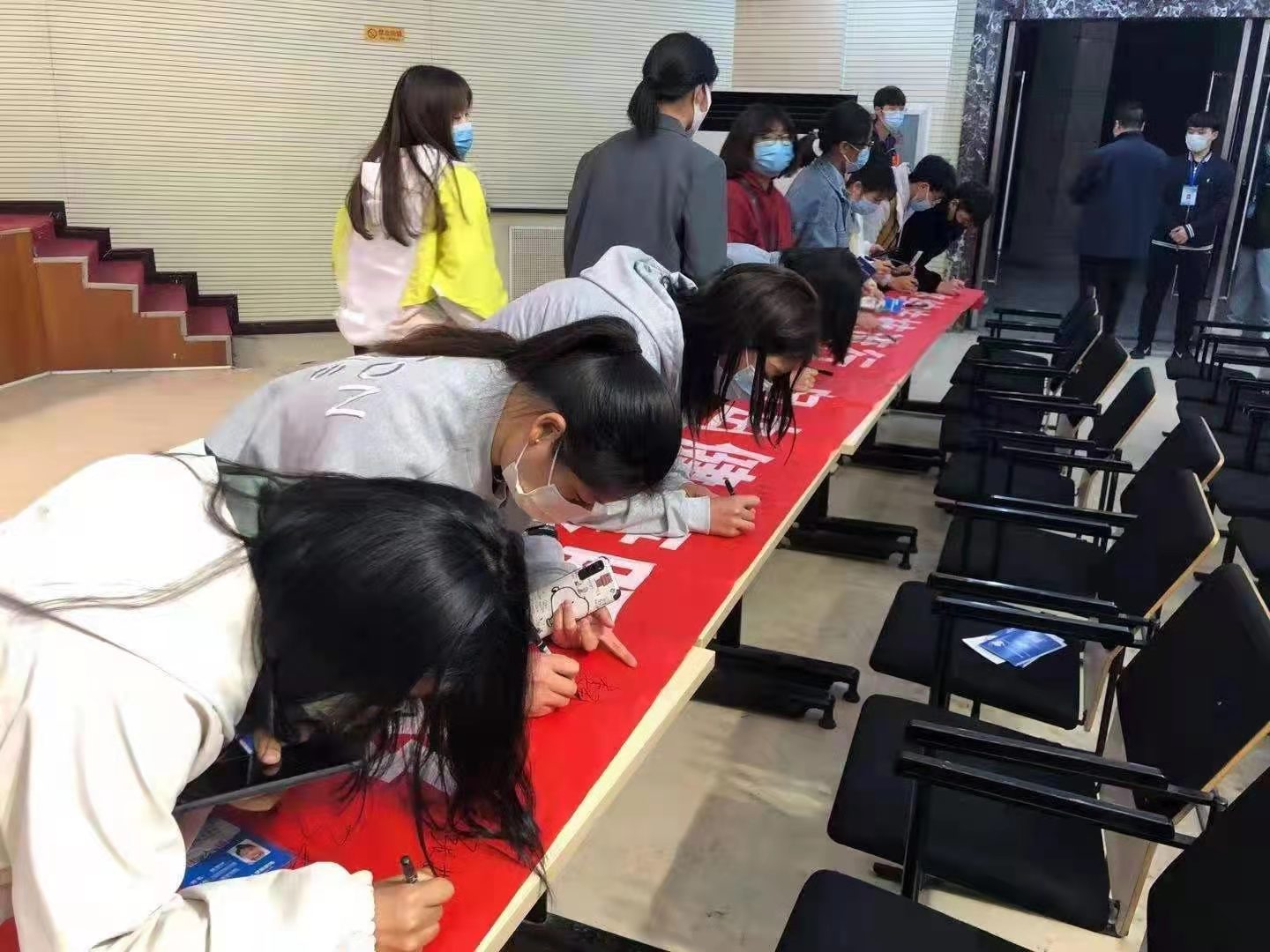 “终结结核流行,自由健康呼吸”的宣传主题横幅上进行签名,学干们协同校医院的工作人员为同学们现场分发一次性口罩及宣传页,大家积极参与到防控结核病行动中。