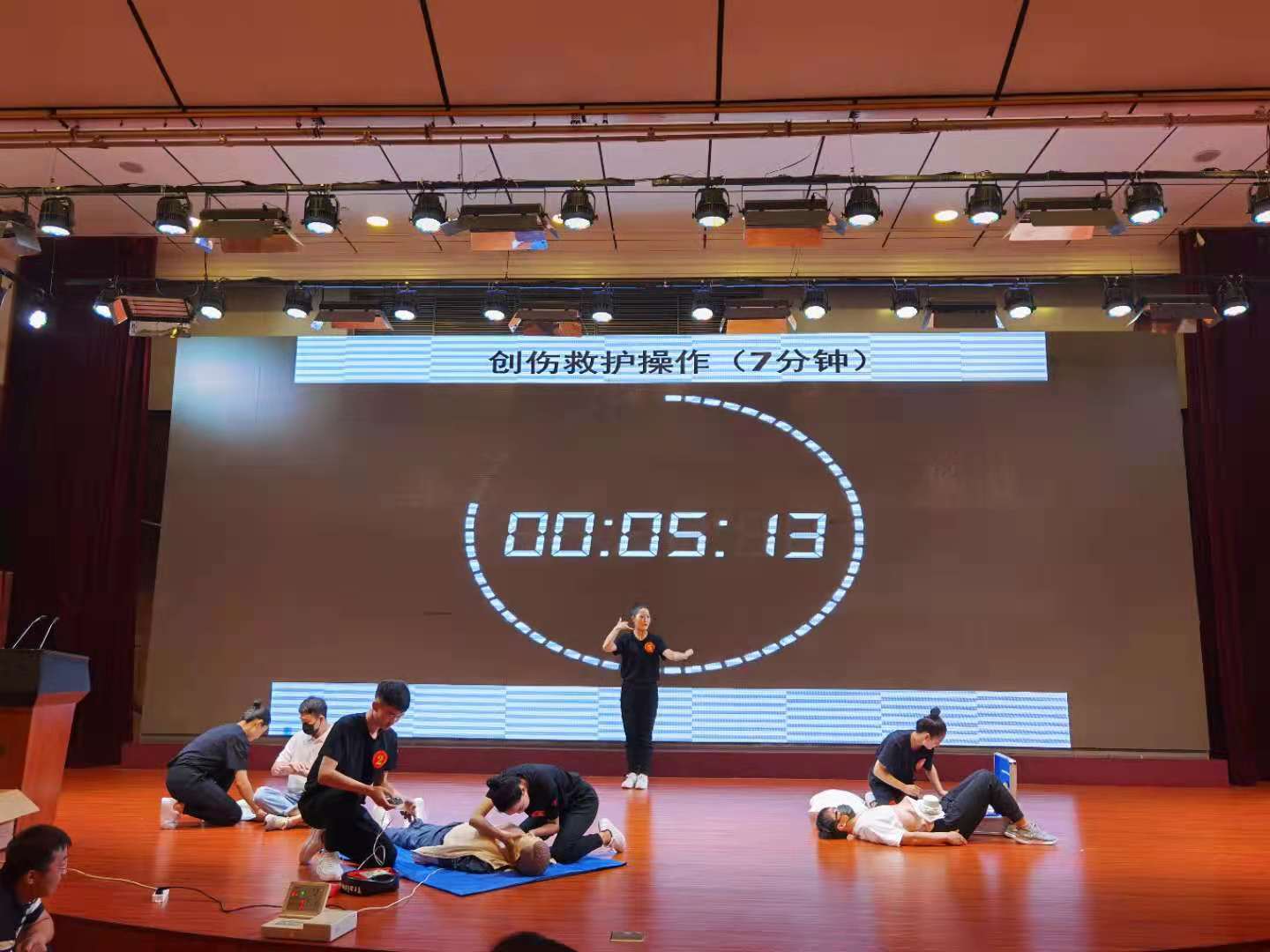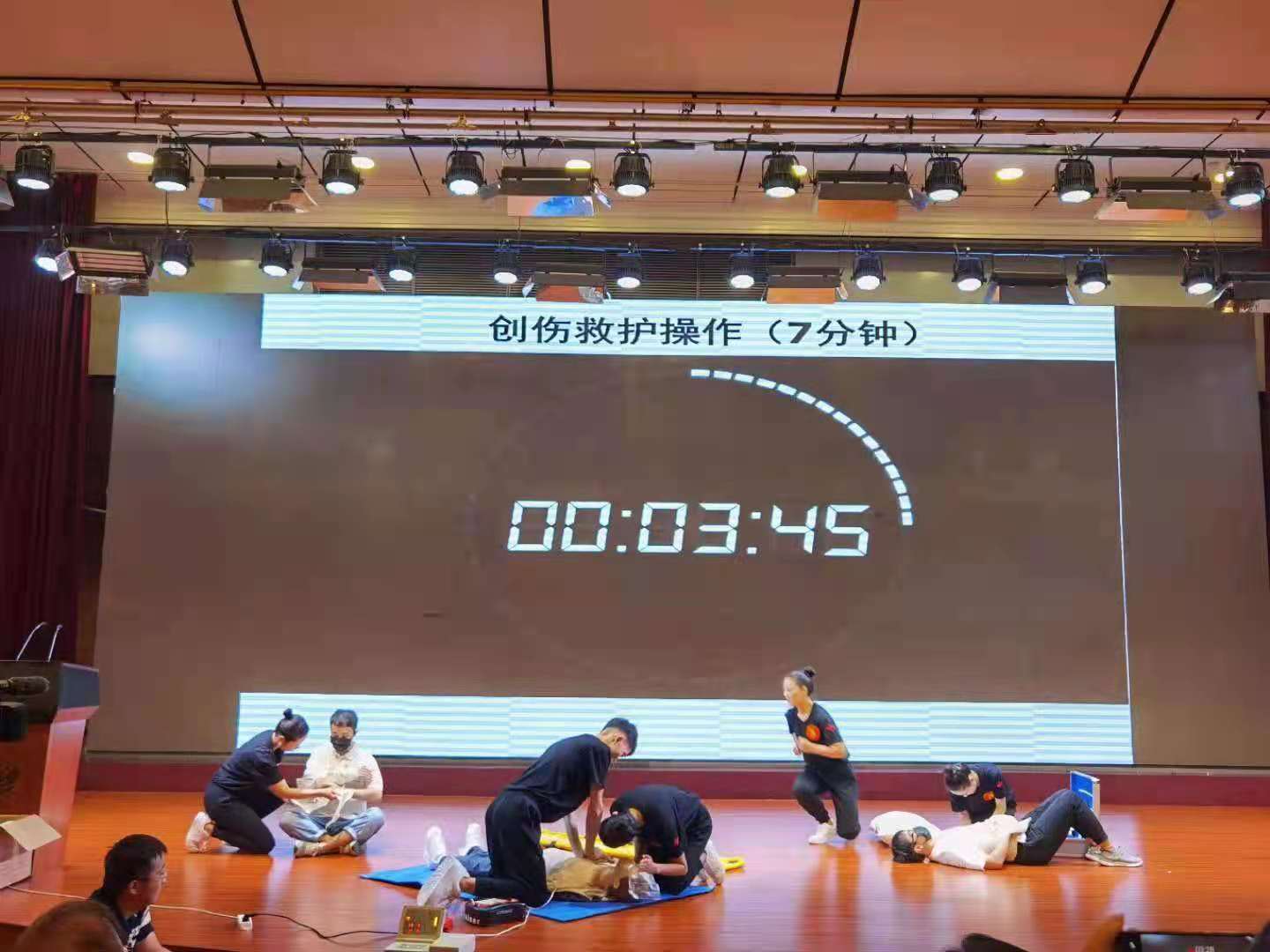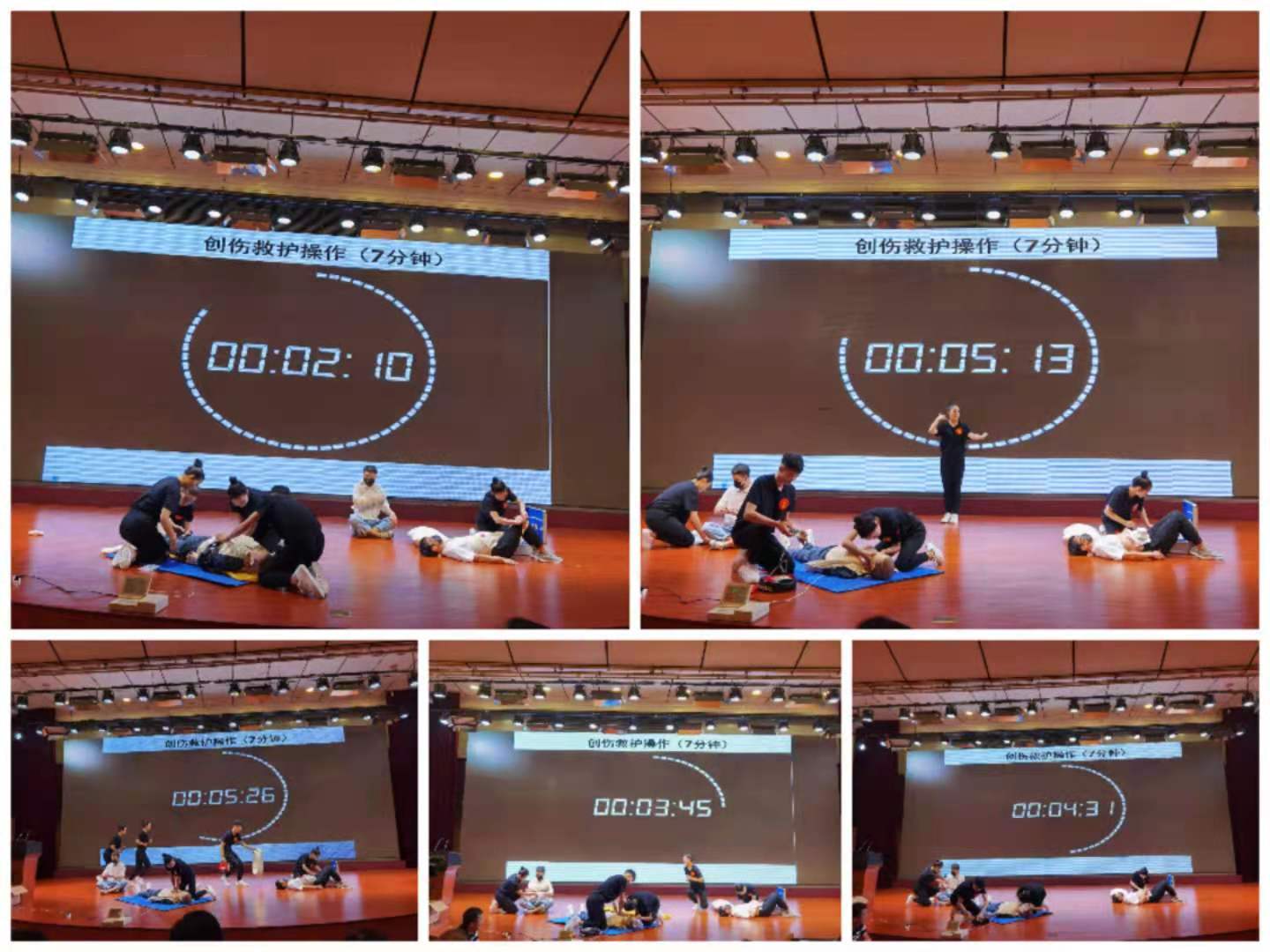 本次比赛内容包括心肺复苏、创伤救护实操、救护演讲及理论答题等四个环节,限时按规定操作。