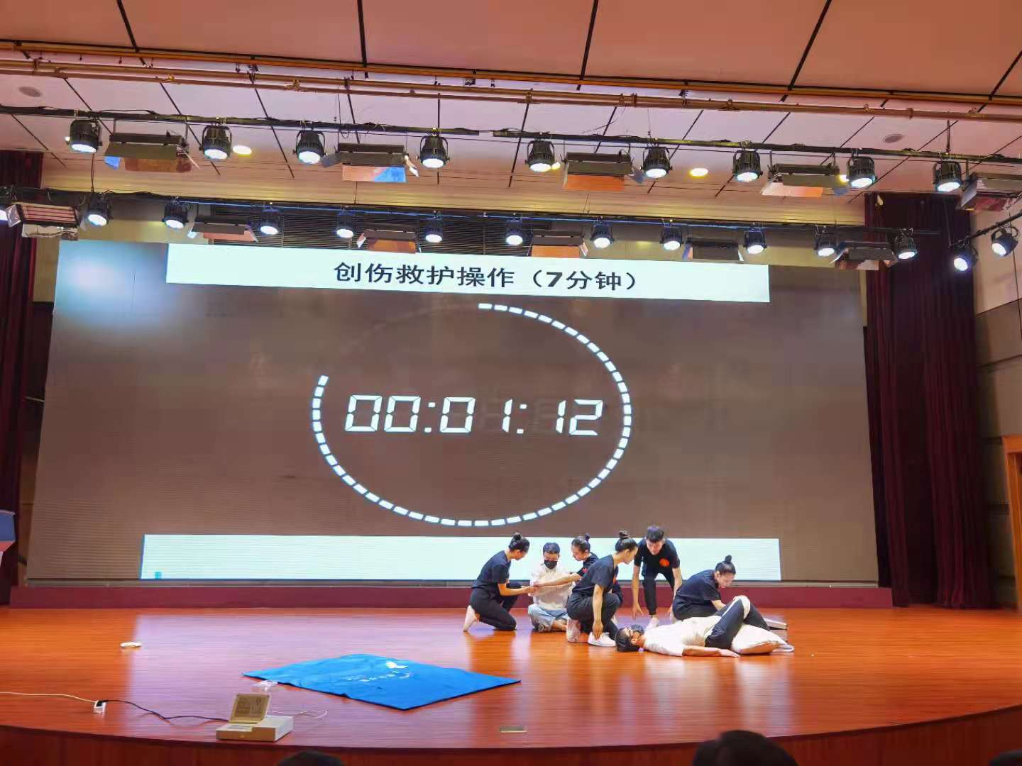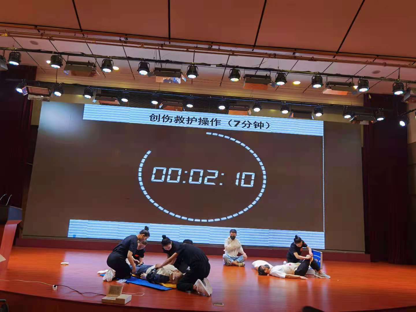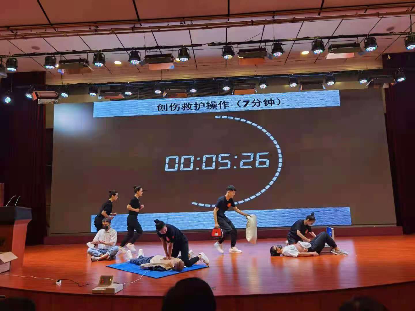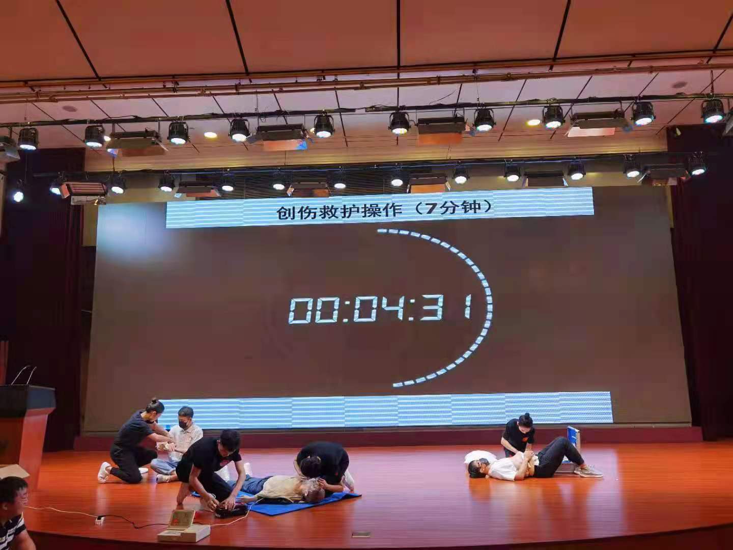 本次比赛内容包括心肺复苏、创伤救护实操、救护演讲及理论答题等四个环节,限时按规定操作。