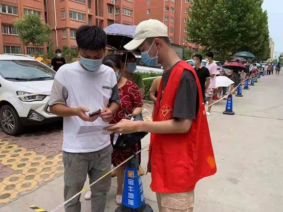 在黄河医院实习的19护理一班孟海瑞,在宏远社区居委会内,参加全市核酸采集志愿服务。