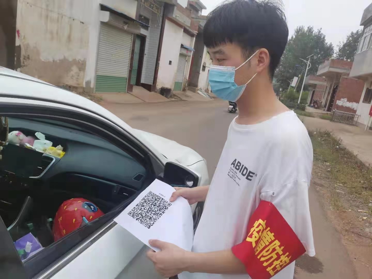 20级护理7班杨帆,在河南省南阳市西峡县丁河镇秧地村疫情防控检测点志愿服务,登记外来人员车辆信息。