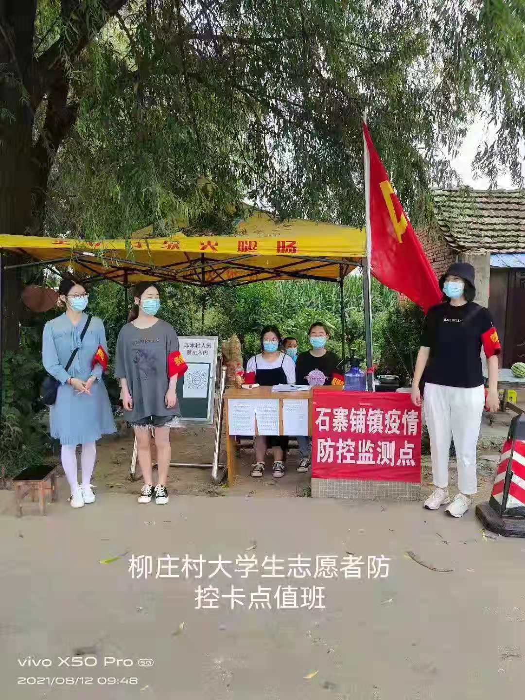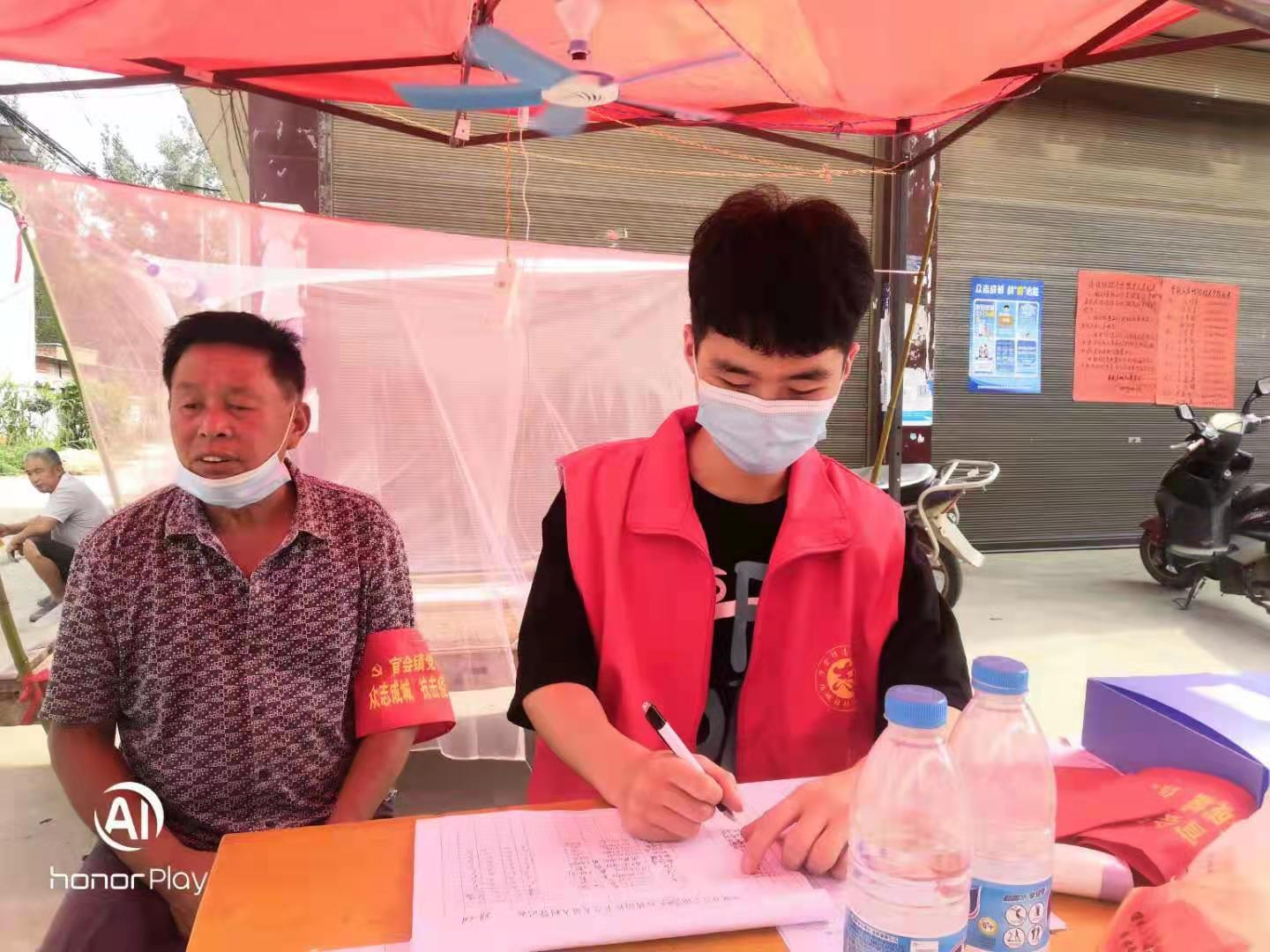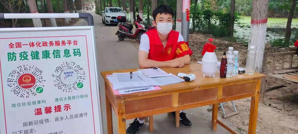 20级康复1班张云威,在周口市商水县郝岗镇参加志愿服务活动,在村口设立卡点,对往来人员进行信息登记,测量体温,查看健康码、行程卡,排查登记未接种疫苗的人员信息。
