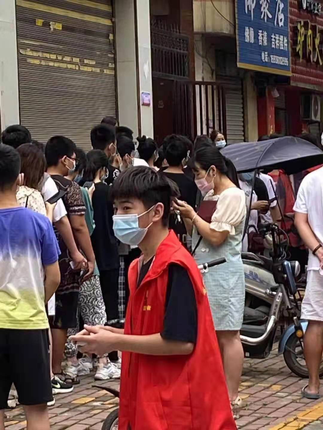 20级护理2班杨含笑,家住湖滨区,在涧河社区参加志愿服务活动,跟随社区人员宣传防疫知识,组织人员有序扫码、排队,帮助工作人员询问登记信息。