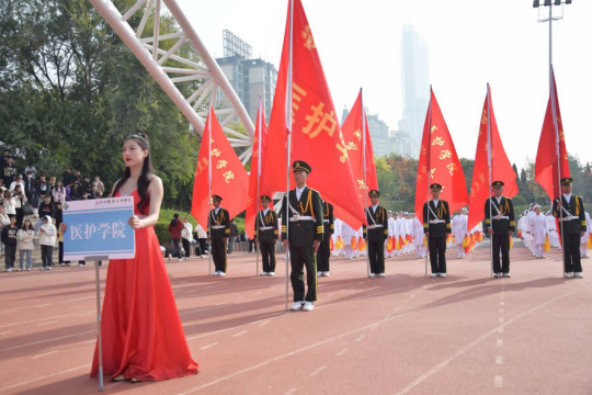 开幕式上,医护学子踏着青春的节拍,迈着整齐的步伐,昂首阔步登台亮相!这是一个团结进取、昂扬向上的集体,也是一支敢于梦想、敢于拼搏、不断进取的团队。他们带着对生命健康和运动精神的礼赞,以别样的风采,高昂的斗志,向我们展示着当代老员工的魅力风采。她们用翩翩的舞姿诠释白衣天使的灵动和使命,她们用青春的笑脸演绎南丁格尔的无私和奉献,成为运动场上最靓丽的风景线!