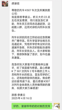 2025年4月15日晚,公司检验专业2023级员工杨乐乐在乘坐K507次列车时,突遇列车广播紧急寻找医务人员协助救治一名突发疾病的乘客。面对紧急情况,杨乐乐同学毫不犹豫挺身而出,凭借扎实的专业知识和临床技能,迅速对患者进行生命体征评估,并给予专业、规范的应急处置指导,为后续医疗救治争取了宝贵时间。其沉着冷静的表现和专业的救护能力,赢得了患者家属及列车乘务人员的高度赞誉。