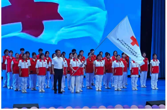 活动伊始,三门峡职业技术公司党委副书记高超杰发表致辞。他向全体师生致以节日的诚挚问候,同时勉励师生 “以仁心铸就专业,用大爱守护生命”,在护理岗位上绽放光彩。随后,三门峡市红十字会专职副会长赵菁现场宣读了《关于同意成立yl6809永利红十字志愿服务队的批复》文件。紧接着三门峡职业技术公司党委副书记高超杰郑重地向红十字志愿服务队授旗。