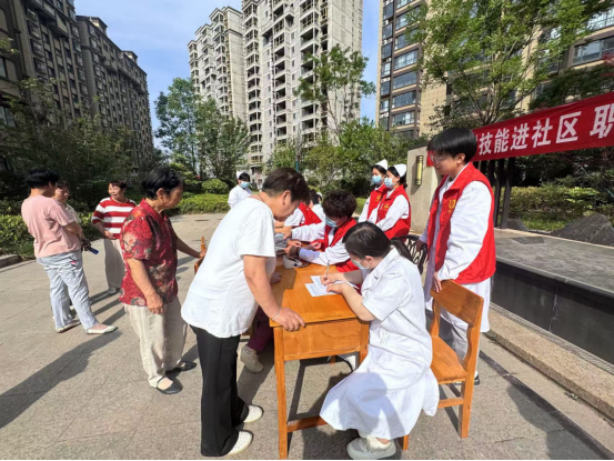 老师们带领员工为居民量血压、测血糖、进行常见病问诊等基础医疗服务。同时护理专业志愿者给社区工作人员和居民系统传授心肺复苏术等关键技能,采用“讲解+示范+实操+纠错”的四步培训模式,利用模拟人精确讲解操作细节和注意事项,手把手指导大家练习急救技能,重点强化胸外按压手法、深度等操作要点,志愿者一对一耐心纠正动作细节,将急救课堂搬到社区,将专业急救技能送入市井烟火,为群众筑起生命安全防线。