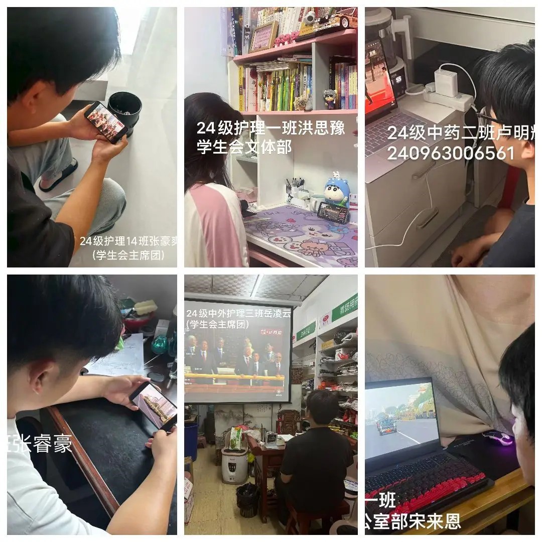 虽然师生们身处不同地方,但爱国情怀将大家紧密相连。公司全体员工通过网络、电视等多种平台准时观看直播。许多同学被阅兵仪式展现的国家力量深深吸引,不时用手机记录下难忘瞬间。
