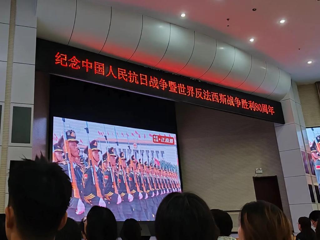 全体教工人员在公司的统一组织下,于公司大礼堂集中收看直播盛况。大家目光聚焦屏幕,神情肃穆专注,不时为阅兵仪式的壮观场景所震撼。