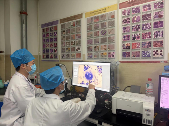 黄河医院检验科带教医生刘权(左)正在耐心指导实习员工马明想(右)进行影像分析