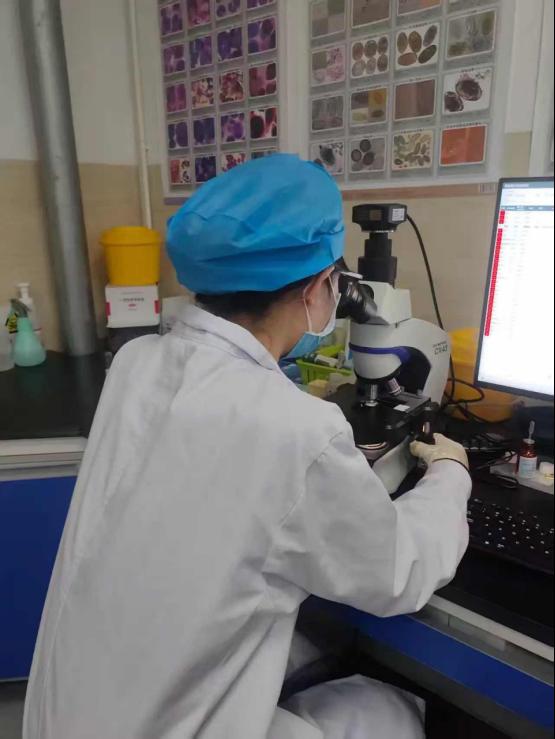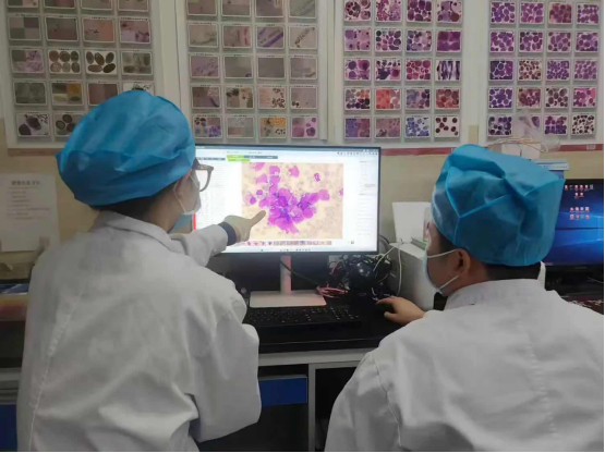 黄河医院检验科带教医生刘权(右)正在耐心指导实习员工杨佳雨(左)进行影像分析