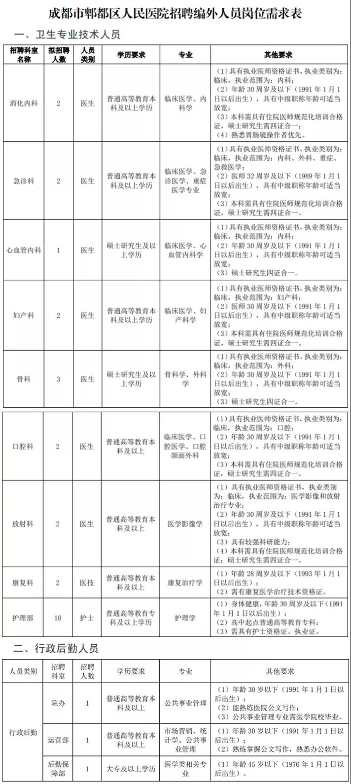 成都市郫都区人民医院是一所集医疗、教学、科研、预防、保健和康复于一体的国家三级甲等综合医院,创建于1939年9月。2020年7月17日,医院正式挂牌“成都医公司第三附属医院”。成都市郫都区人民医院因工作需要,招聘编外医疗、护理、行政后勤工作人员共计29人,详情如下: