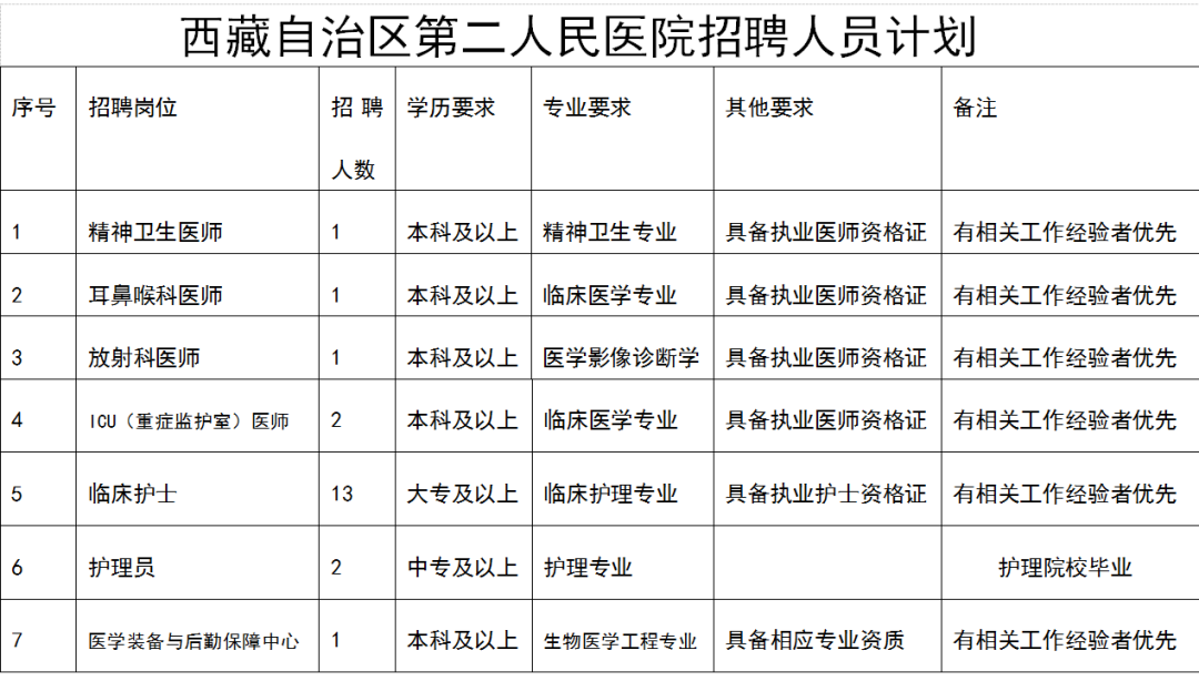 为满足西藏自治区第二人民医院发展需要,特向社会公开招聘编外医护人员,现将有关事项公告如下: