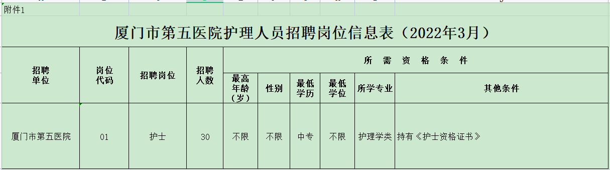 附件1:《厦门市第五医院护理人员招聘岗位信息表》