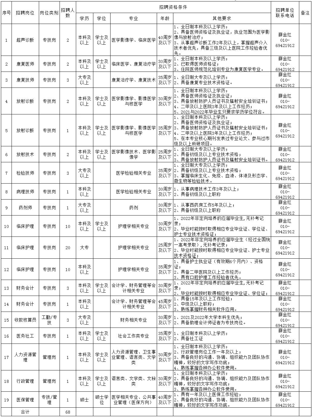 本次招聘19个岗位共计68人。详情见附件《北京市顺义区医院2022年招聘编外卫技、财会、管理等岗位资格条件表》,以下简称《岗位资格条件表》。