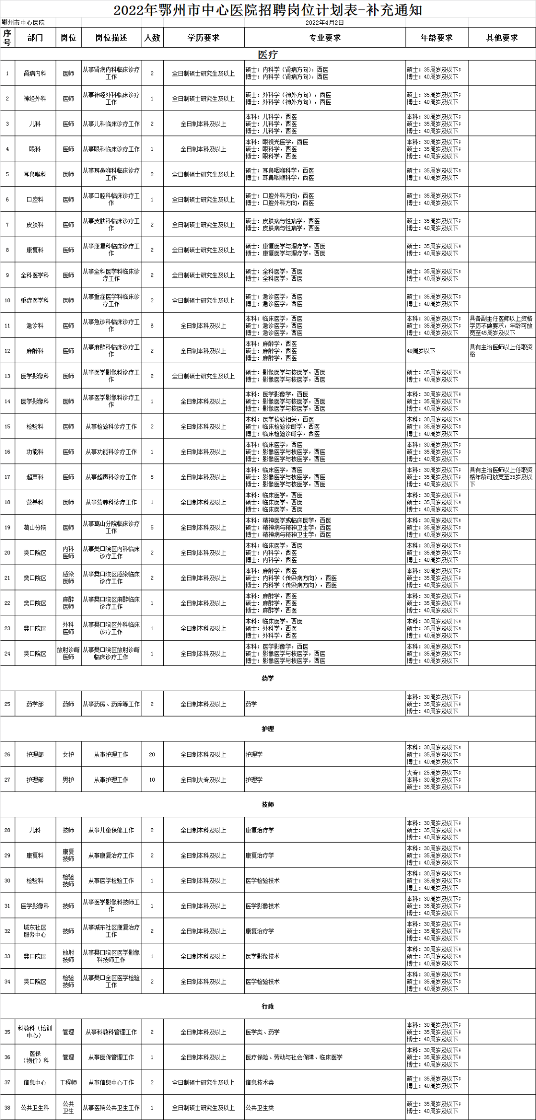 详见附件2《2022年鄂州市中心医院招聘岗位表-补充通知》。
