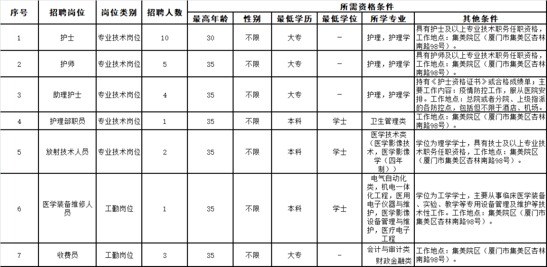 具体的招聘人数、招聘岗位及招聘条件详见《厦门医公司附属口腔医院2022年补充辅助岗位人员需求信息表(2022年4月)》(附件1)