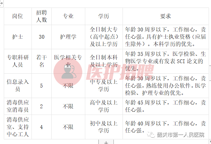 医护招聘温馨提示:广东省韶关市第一人民医院,2022年招聘护士、专职科研人员、信息录入员等人才,报名截止至2022年5月15日。欢迎人才加入公司!