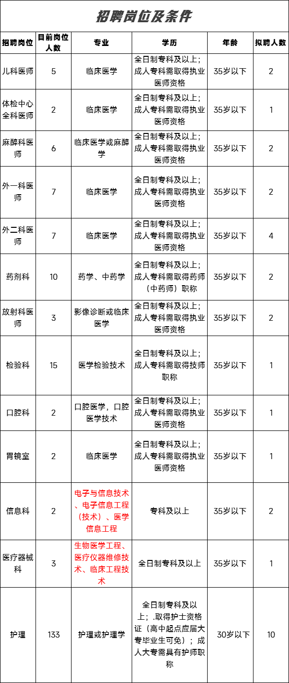 本次计划招聘医、药、护、技、后勤等岗位,具体岗位、专业,招聘条件等详见附件1。