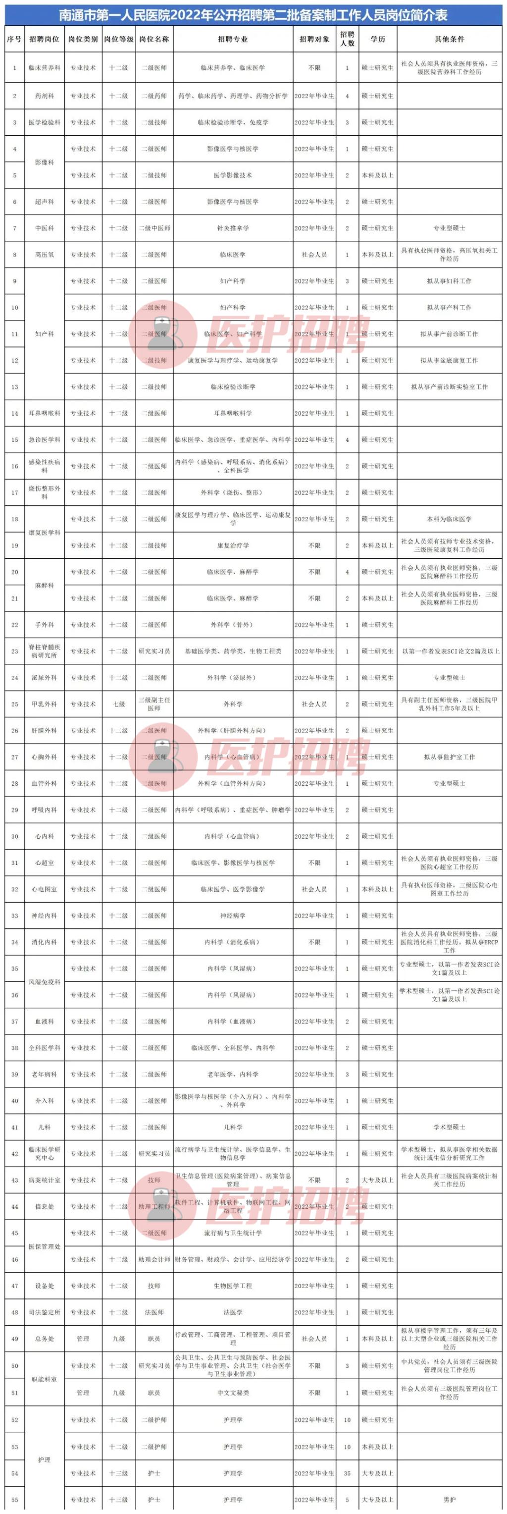 医护招聘温馨提示:江苏省南通市第一人民医院,2022年度招聘护士、临床医师、影像医师、检验技师、药师、中医师、急诊重症医师、康复医师等145人,报名截止至2022年6月25日。欢迎人才加入公司!