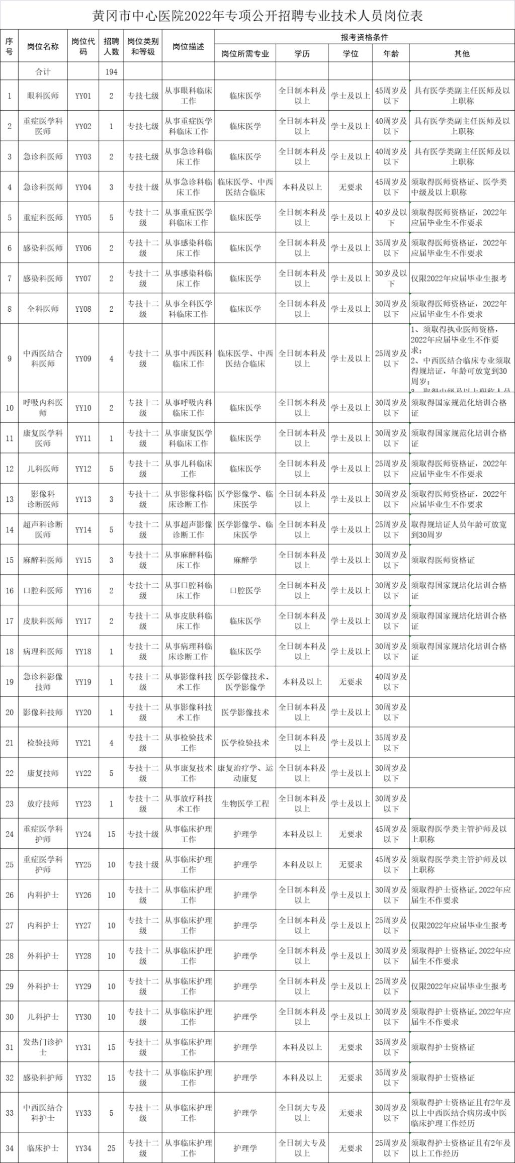 共计招聘194人。招聘岗位、人数及资格条件详见《黄冈市中心医院2022年专项公开招聘专业技术人员岗位表》(附件1,以下简称《岗位表》)。