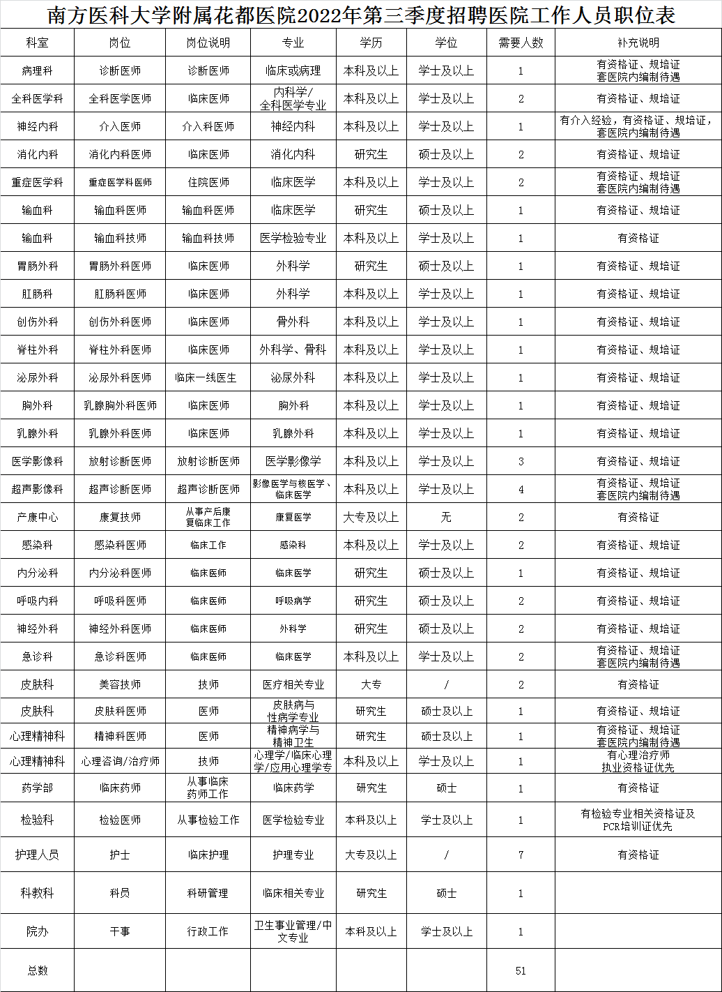 具体招聘岗位见《南方医科大学花都医院2022年第三季度招聘医院工作人员岗位表》(文末附件)。