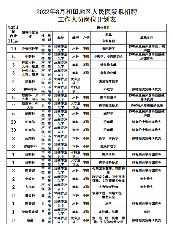 具体岗位条件详见《2022年8月和田地区人民医院拟招聘工作人员岗位计划表》。