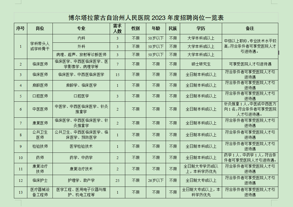 招聘岗位及要求详见《博尔塔拉蒙古自治州人民医院2023年度招聘岗位一览表》。