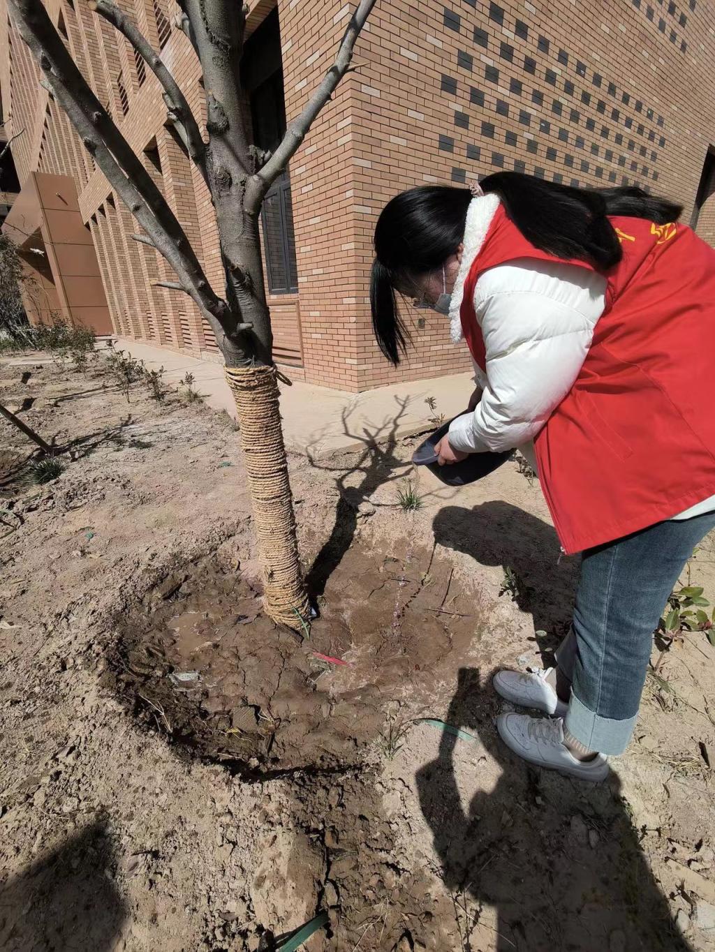 一大早,志工部的部员们来到校园,同校内园丁工作者一起开始植树活动。大家分工明确,热情高涨,有的给小树挖坑,有的移树,有的填埋,有的归垄,有的浇水,忙的不亦乐乎……经过数小时的辛勤劳作,种树任务完成,同学们又对周边已有树木进行了浇水和维护。活动结束后,同学们纷纷拿出手机,一起拍照留念,共同见证美好瞬间。不时有同学感叹道:期待明年春天,这里的一片勃勃生机!