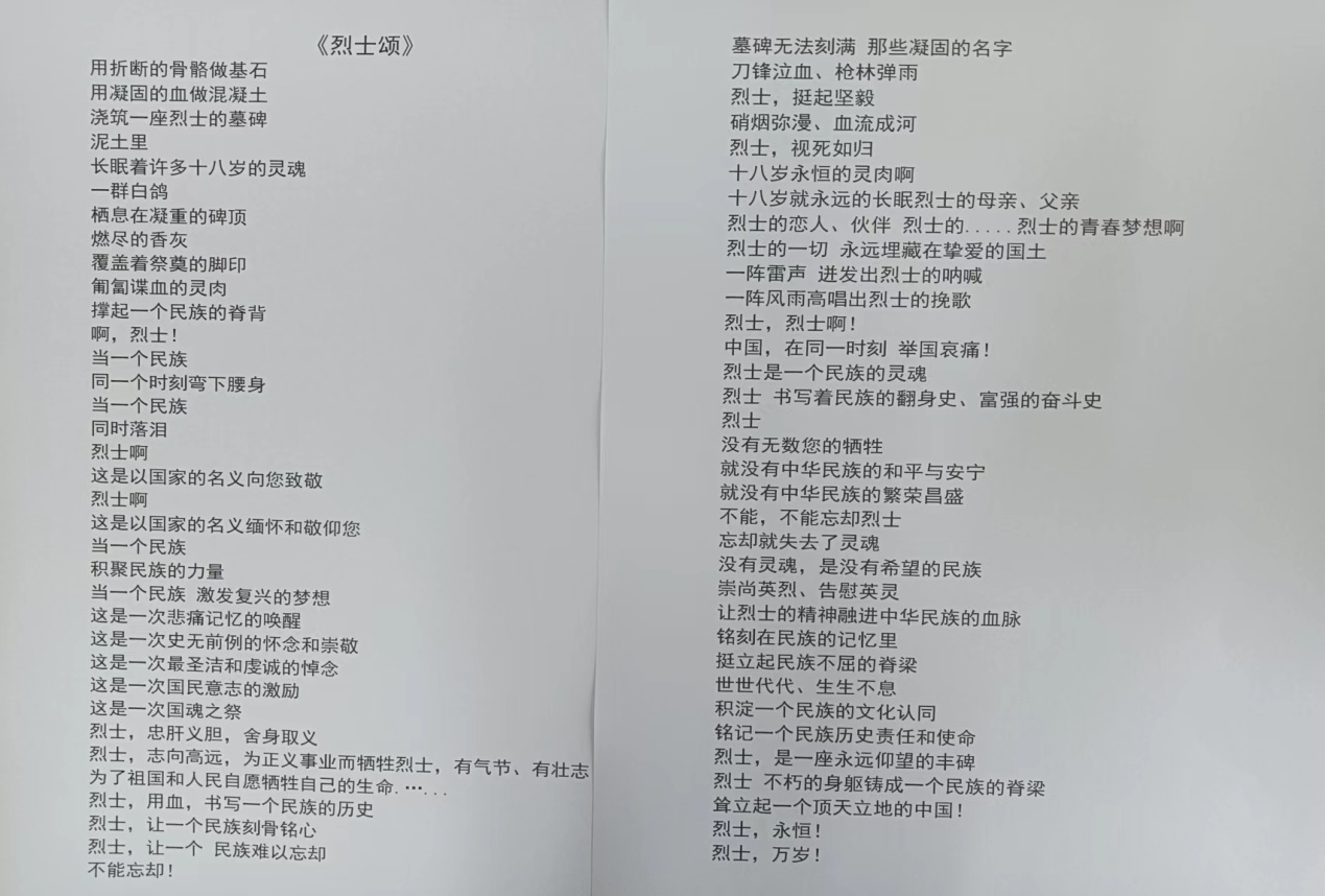 接着,全体党员集体诵读经典《烈士颂》,通过朗诵《烈士颂》,歌颂革命先烈们为国牺牲的大无畏精神,号召全体党员向为民族独立、人民解放和国家富强、人民幸福作出巨大贡献和牺牲的英雄烈士致敬。