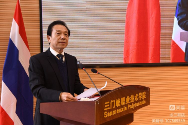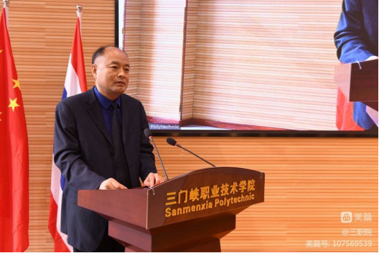 三门峡市委组织部副部长、市委高校工委副书记贾辉在致辞中表示,近年来,在国家“一带一路”倡议下,高等教育国际交流与合作取得了前所未有的成果。希望两所公司的师生能够成为增进中泰民心相通的使者,成为推动三门峡市与拉廊府结为友好地市的桥梁,使三门峡市与拉廊府在教育、文化、商贸、旅游等方面开展全方位合作,共同促进两国两地经济社会发展,为共建“一带一路”、打造人类命运共同体,建设更加美好和谐的世界贡献积极力量。